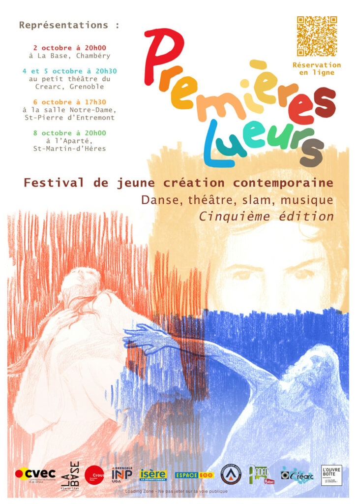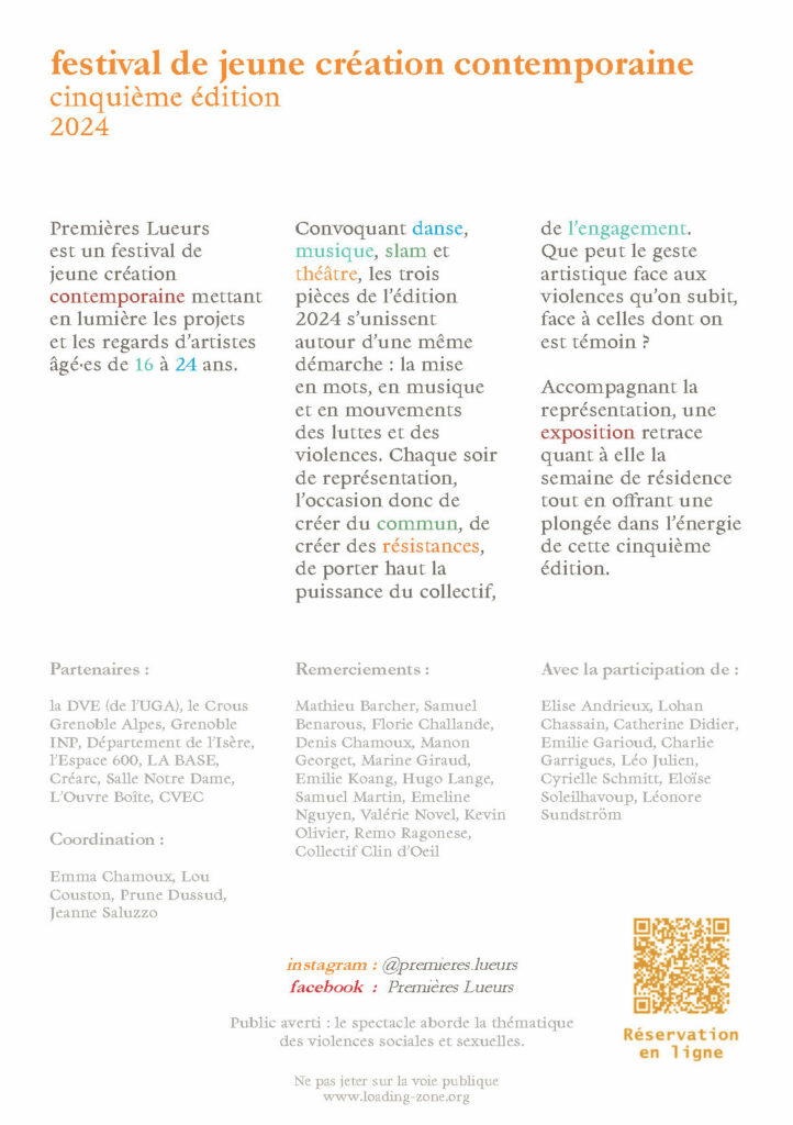 Premières Lueurs est un festival de jeune création contemporaine mettant en lumière les projets et les regards d’artistes âgé·es de 16 à 24 ans. Convoquant danse, musique, slam et théâtre, les trois pièces de l’édition 2024 s’unissent autour d’une même démarche : la mise en mots, en musique et en